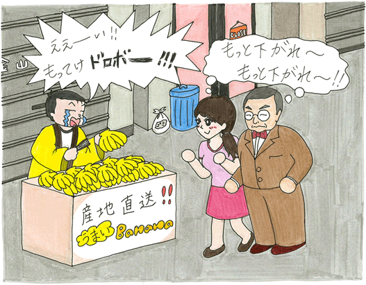 そう。バナナのたたき売りは、まず売りたいおじさんがいる。おじさんは少しでも高く売りたい。だからたとえば500円!とかいうわけ。でも、それじゃ誰も買わない。だから450円とか420円とか、少しずつまけてくる。もちろん買い方はじっと息を殺して「もっと下がれ~、もっと下がれ~」ってココロの中で念じてるでしょ。 |